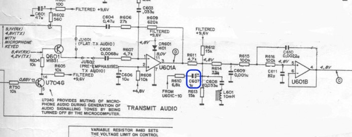 Per ridurre il livello del tono CTCSS in trasmissione bisogna dissaldare un terminale del condensatore elettrolitico C607 da 1uF ed inserire in serie un trimmer da 22 Kohm. Aumentando la resistenza si ridurrą il livello del subtono e viceversa.